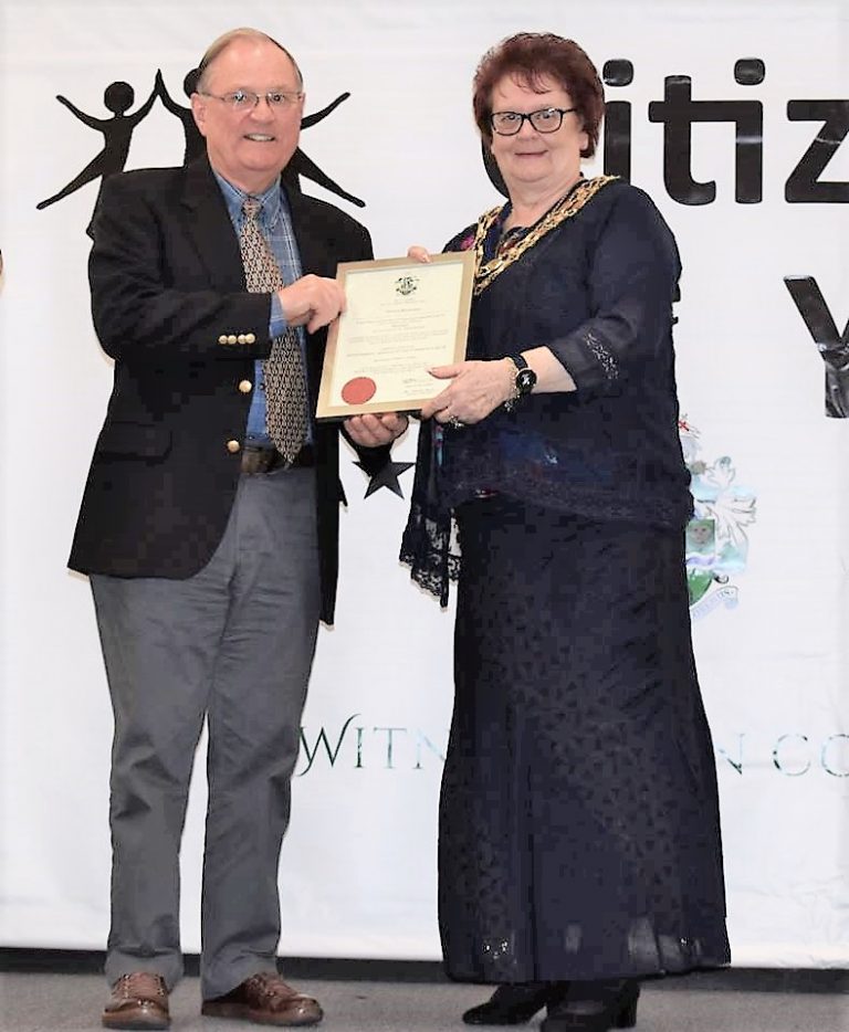 Witney Talking News Chairman, Peter Brading, has been awarded a certificate of merit by Witney Town Council for “Outstanding Service to the Community” in recognition of the work he has done over 40 years of service to Witney Talking News.